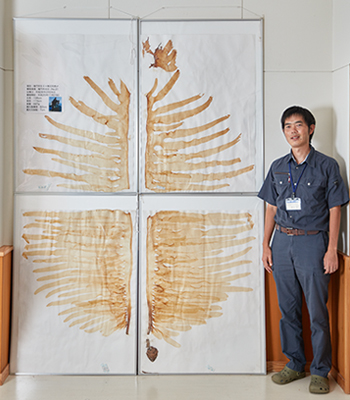 2013年、本県のなかでも太平洋側の暖かい地域である阿南市椿泊で、色のいい、肉厚の大きな天然わかめが見つかったので、オス配偶体に使用してみました。すると、最初の試験段階で「これはいい!」というものができたのです。そういうことはなかなかないのですが、オスメスの相性もたぶんよかったんだろうと思います。