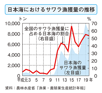 もう一方で、日本海ではサワラが東シナ海から来遊するようになりました。いままで日本海ではサワラという銘柄はなかったんですよ。それが90年代から急に増えて、現在は北海道ぐらいまで獲れるようになりました。その要因として、東シナ海での資源量が増えたことと、日本近海の海水温の上昇によると考えられています。