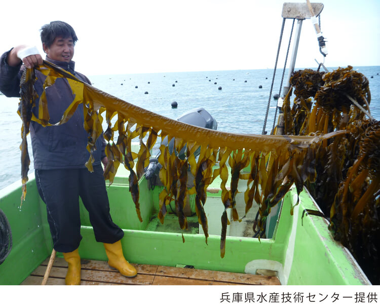 南あわじ漁業協同組合(以下「南あわじ漁協」)の丸山地区では、養殖ロープが延べ約450㎞にもおよぶ大規模なワカメ養殖が営まれています。兵庫県のワカメ養殖は6次産業化が進んでおり、生産量は公表されていませんが、県のワカメ生産量の8割以上を占め、単一組織としては西日本最大の生産規模を誇っています。