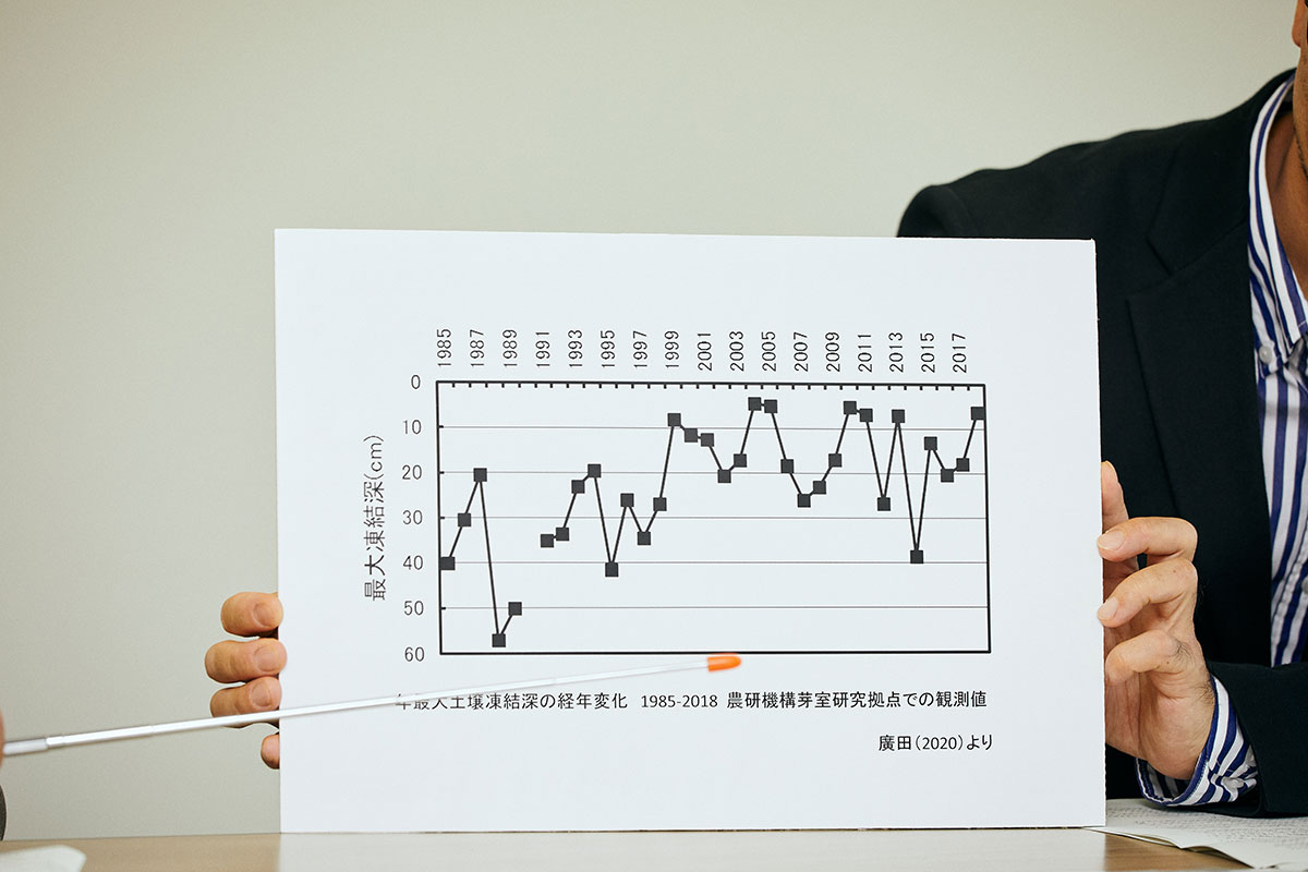 小南さん:廣田教授が1999年から1年半、カナダ・サスカチュワン大学に滞在した際に地温の変動・土壌凍結に関する研究手法を学び、十勝やオホーツク地方の冬の土壌凍結深を調べたところ、減少傾向にあることが確認されたという話を伺っています。さらに、1993年の水稲大冷害や1994年の猛暑以降、異常気象と呼べる現象が増えてきたようです。