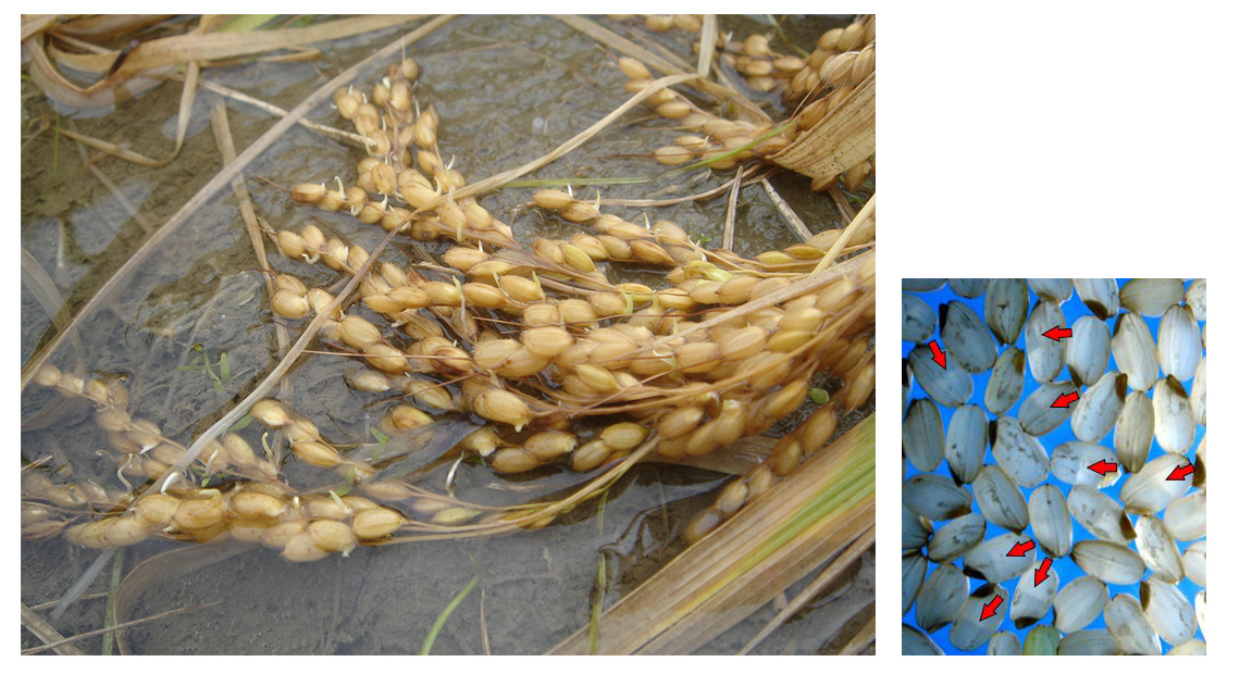 しかし農水省が発表したように、収量が大きく減るような状況ではないのです。「日照りに不作なし」という言葉があるように、この高温は日射量の増加とともに収量にはまだプラスに働いているのですが、あまりにも暑すぎると不稔(米粒が実らない)が起こったり、米が白濁したりしてしまうという報告が特に日本の南の方から聞かれています。さらに穂が高温に当たり、収穫のときに乾いたり雨で湿ったりを繰り返していると、最終的に割れてしまうのです。