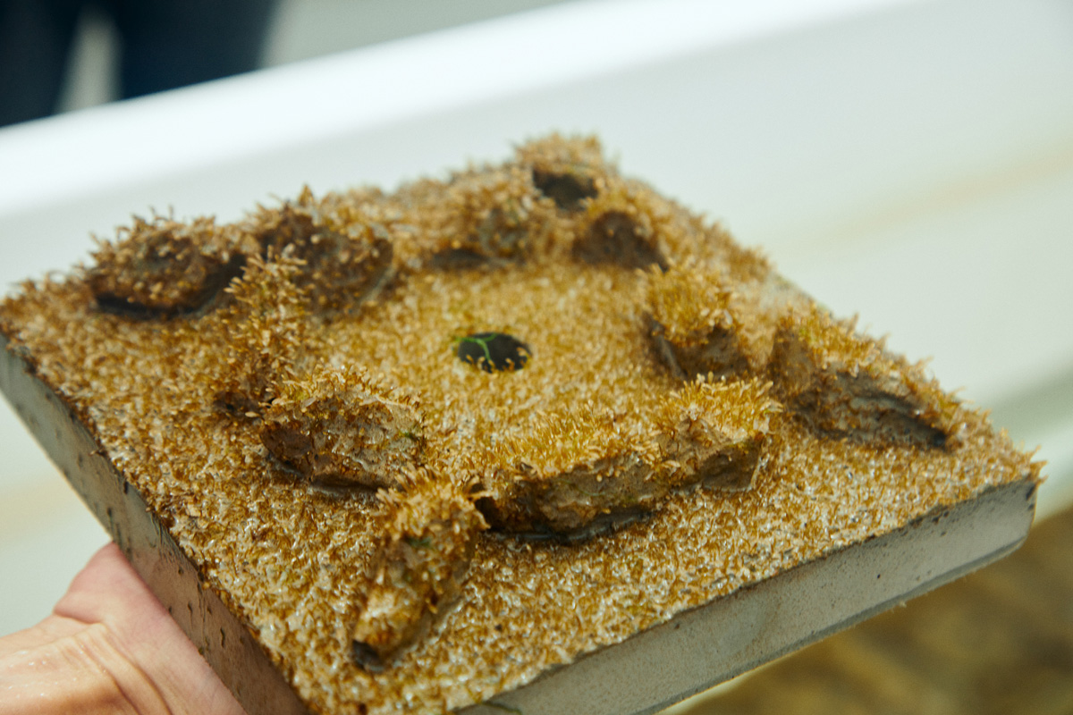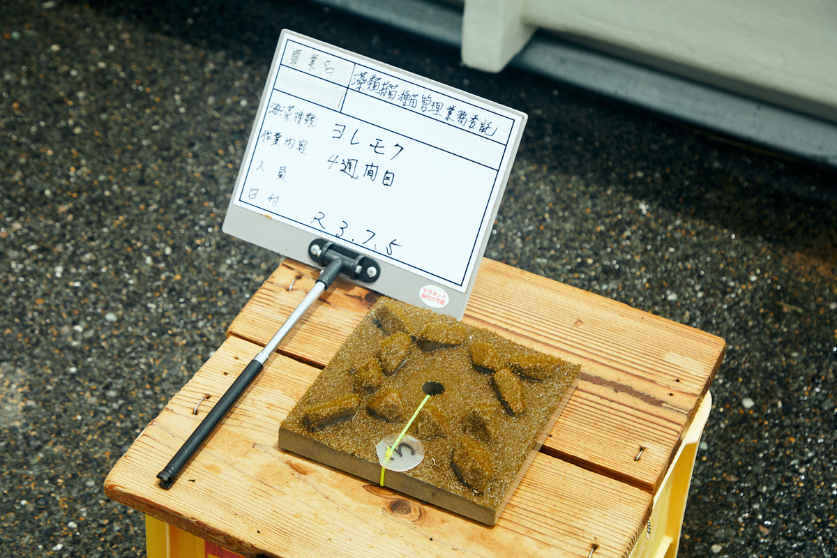 アラメやカジメは糸に種苗を付けた「種糸」を作ることができるので、いろいろな部材に巻き付けられるというメリットがありました。しかしホンダワラ類は種が大きく、種糸という形の種苗を作ることが困難です。そのため、コンクリートの部材に直接種付けをしていくという、新しい方式の種苗生産方法をとることになりました。