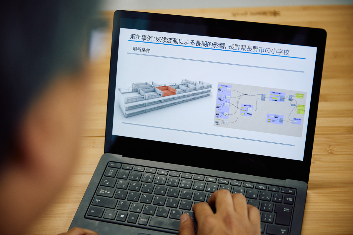 安全かつエネルギー消費の少ない建物をつくるには、将来予測から建築熱解析に必要な情報を取り出して、さまざまな建物仕様に活かしたり、地域で解析を行いながら検討したりする必要があります。情報処理の技術は課題のひとつですが、今後はますます将来予測データの利用が進み、建物の設計に活かされていくでしょう。