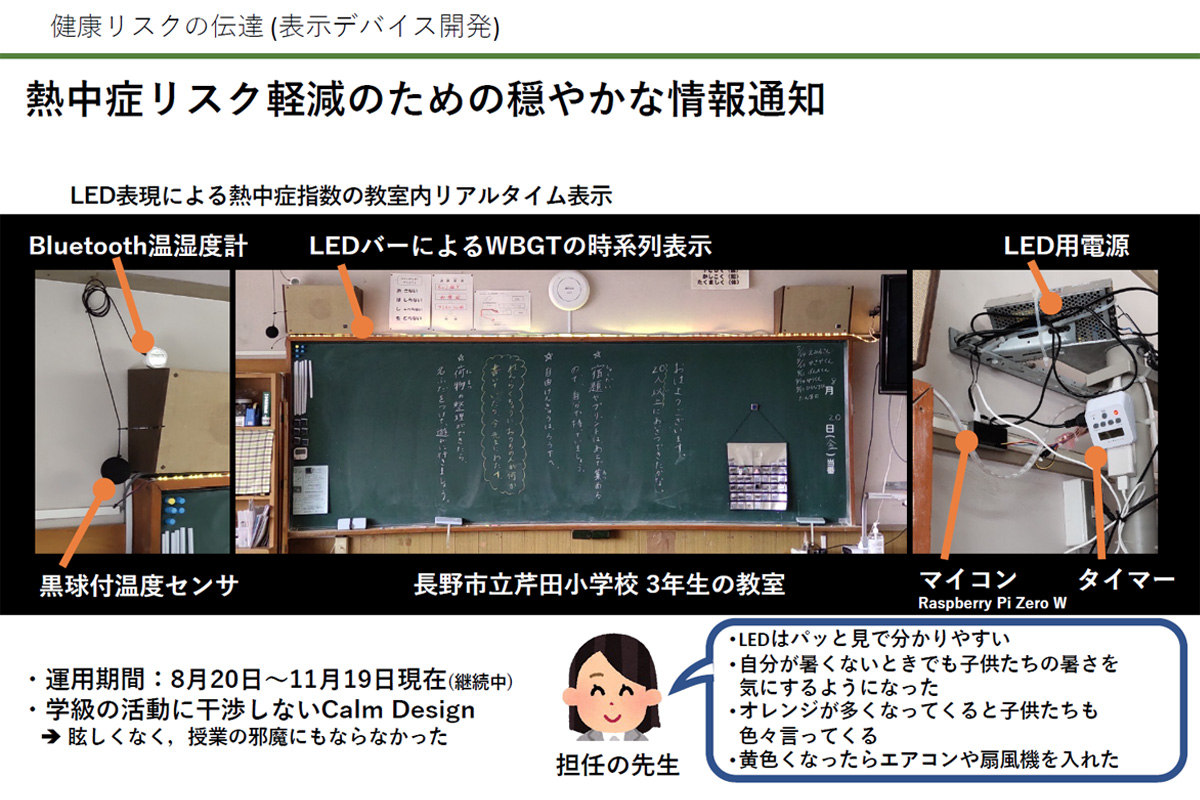 しかし授業中にベルなどで危険を知らせると、授業の妨げになります。そこで熱ストレスをさりげなく伝えるIoTデバイスを電子制御の専門家と連携して開発しました。これは黒板上部にLEDテープを貼り、WBGTが28℃を超えたところでオレンジ色に変化する仕組みです。1年間運用したところ「先生、28℃を超えたよ」と生徒が声がけをすることによる先生とのコミュニケーションツールとしてもうまく機能し、現場からのヒアリングとしては好評と聞いています。