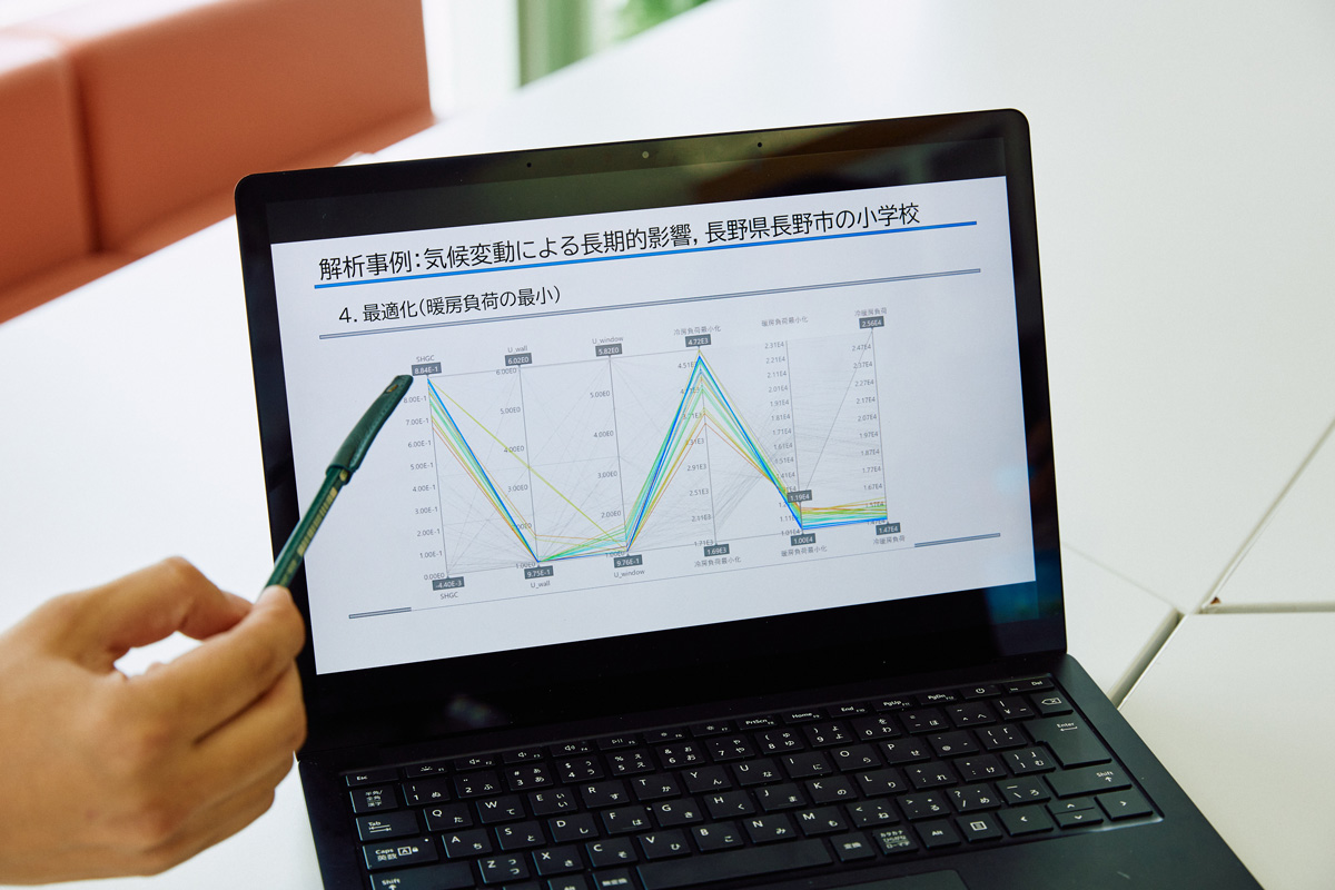 そこであらゆる状況を計算して、統計的に多目的最適化を行い,地域や季節にあった建物性能や運用方法を見つけていくという研究を進めています。現在の小学校を建て替えるときには、もう2100年が視野に入ってきます。そのときにはかなり気温が上がっていることが想定されるため、パッシブデザインも考慮し、室温を上がりにくくする建物の形状を主要テーマにして取り組んできたいと思っています。