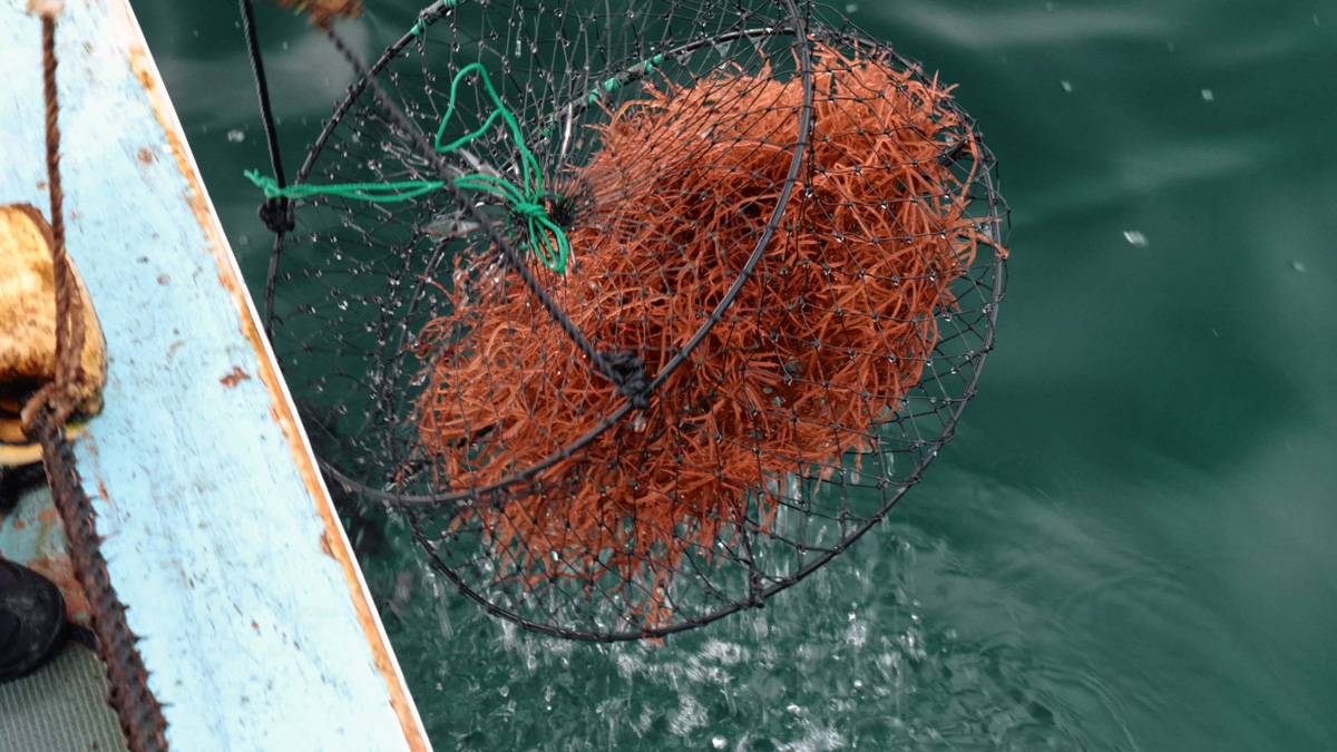 僕らは漁場を持っていないので、漁師さんに種を渡して育ててもらい、育った海藻を買い取って販路につなげるという流れです。天草の海面栽培拠点のひとつでは、カゴでトサカノリを育てています。もともと熊本県や鹿児島県でたくさん収穫されていた海藻なのですが、年々水揚げ量が減っていて、去年は鹿児島で過去一番少なかったんですね。それを増やせないかということで、育てる技術を作っているところです。