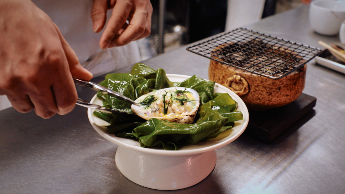 生江:これはハマグリの殻のなかにスジアオノリと炊いたリゾットを入れ、ハマグリの身と出汁などを加えたのち、もう一度スジアオノリを載せて、しその花とゆずの皮を散らしています。下にはワカメを敷いて、冬から春の海の風景を切り取ったようなイメージをつくりました。