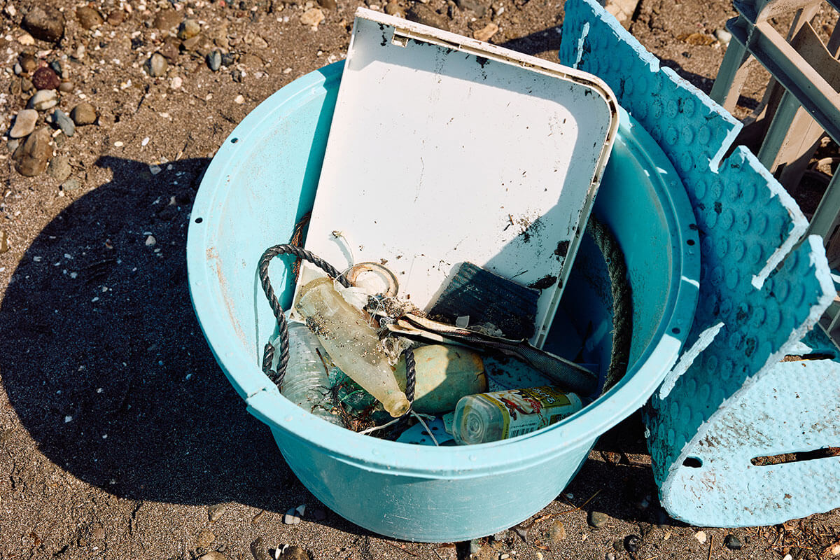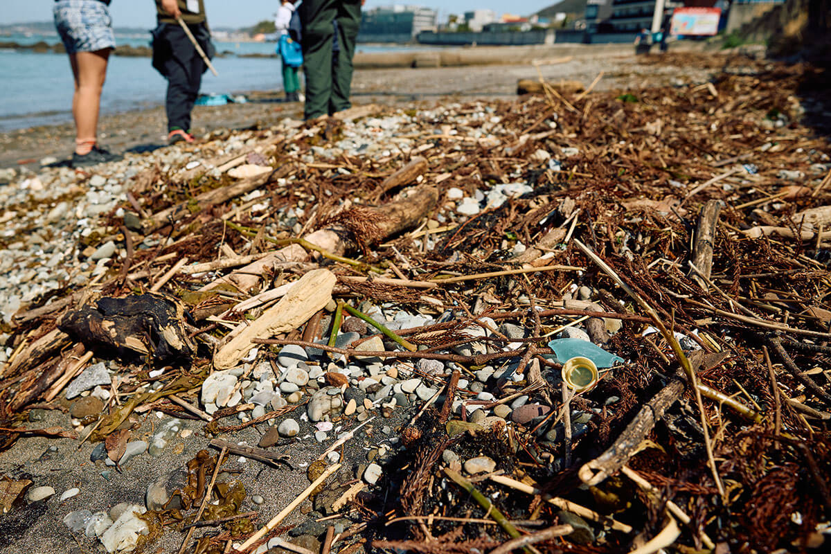 葉山町に住む人たちは海を愛し、積極的にゴミ拾いをしているため、海岸は比較的いつもきれいに保たれています。しかしワカメDAY前日は風が強く大荒れだったせいもあり、海岸には流れ着いた大きなカゴやガラス、ペットボトルなどのゴミがあちこちに散らばっていました。少ないながらも、拾い歩くとゴミはバケツいっぱいに。