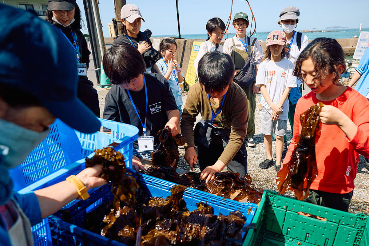 次に、ワカメの釜茹を体験。まずはワカメの根本についている、ひだ状の「メカブ」の部分と、穂先の朽ちている部分を切り取ります。こちらは子どもたちもお手伝い。