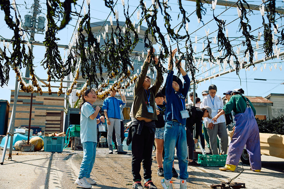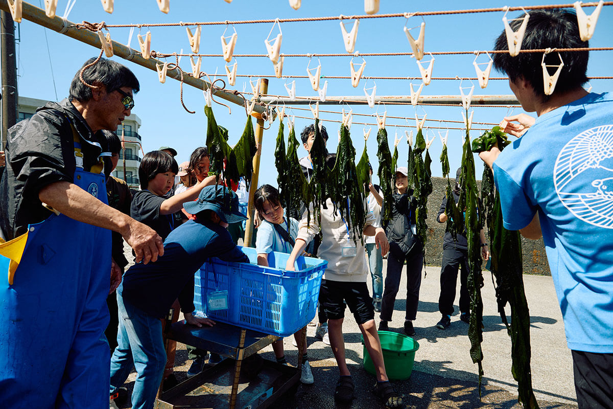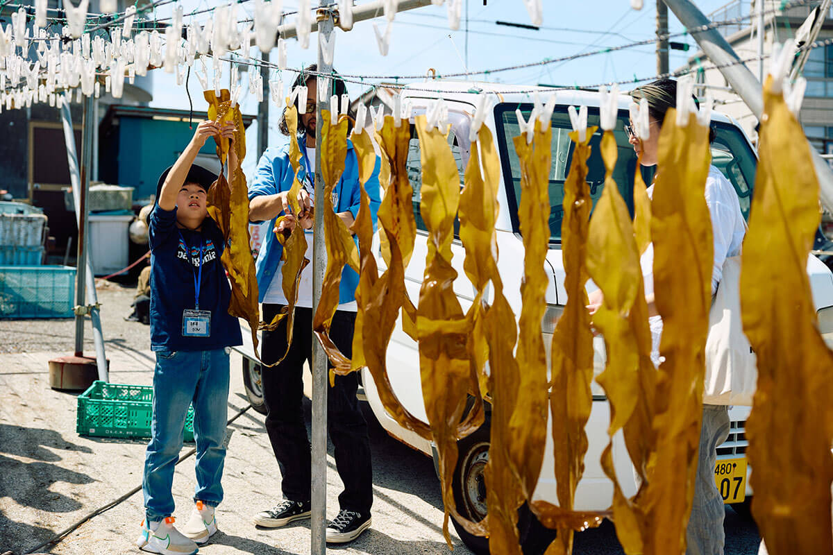 その後はワカメのほか、養殖コンブについてもひたすら干していきます。みんなで集中して取り組んだおかげで、たくさんあった海藻がみるみるうちに干されていきました。