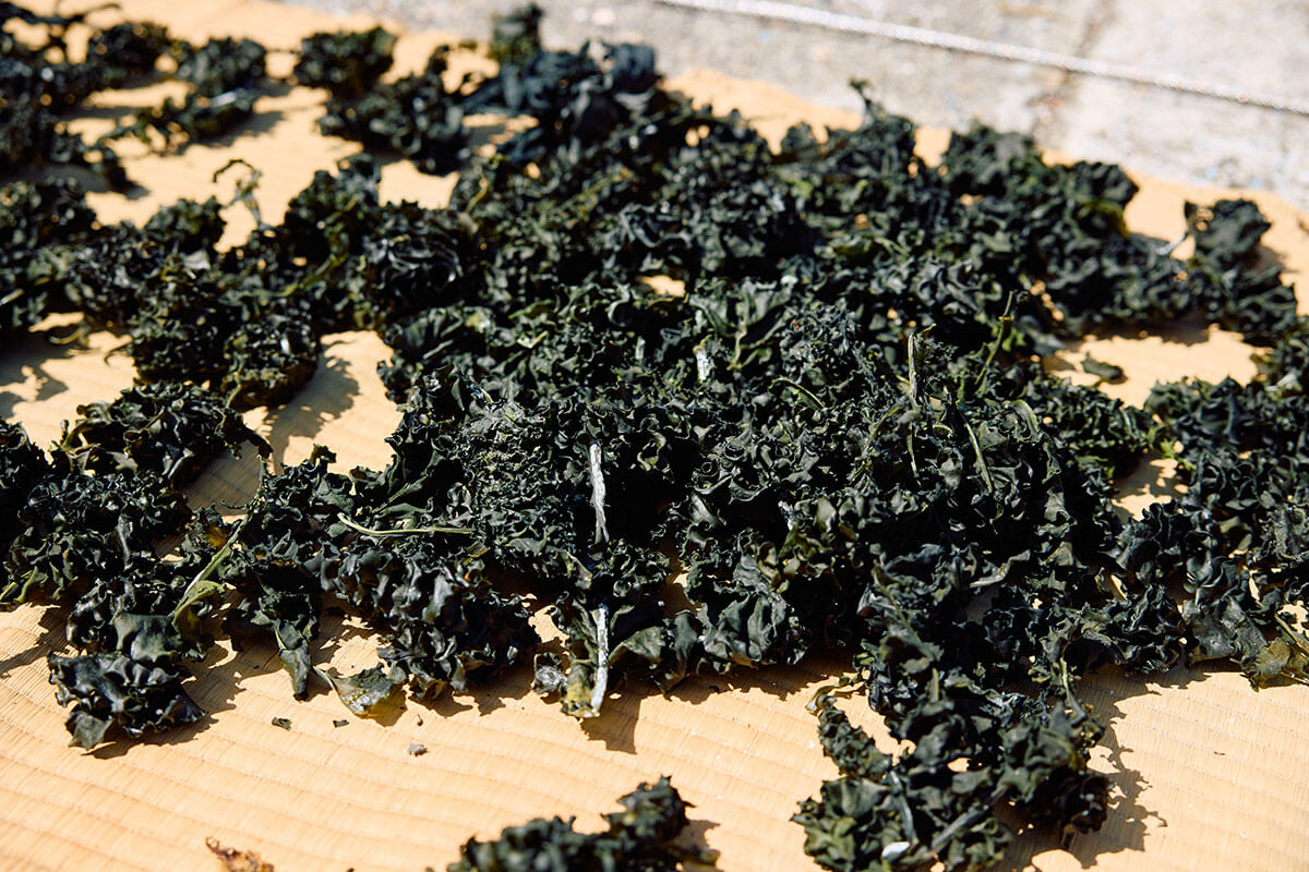 一方ワカメは、よく晴れた日は1日程度で乾くため、お天気を予想しながら収穫を行っているそうです。晶さんたちが手間をかけてくれたおかげで、昨日干したワカメはカラカラに乾いていました。茹でたワカメを干す前に、まずは取り込みます。