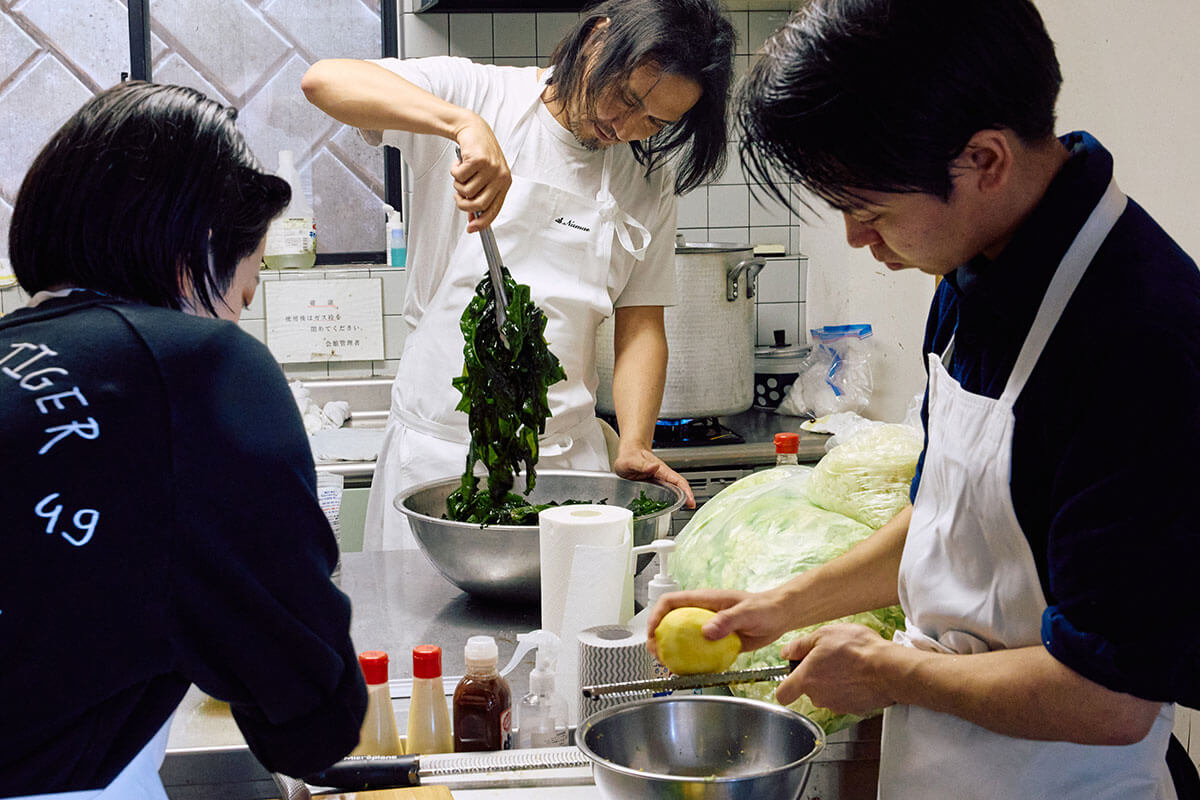 そしてメインは、ワカメのパスタです。同じ相模湾内の真鶴でとれた無農薬のレモンの皮をすりおろし、旬の春キャベツと、ごま油で和えたワカメを絡ませました。フレッシュな酸味と磯の香りがよく合います。