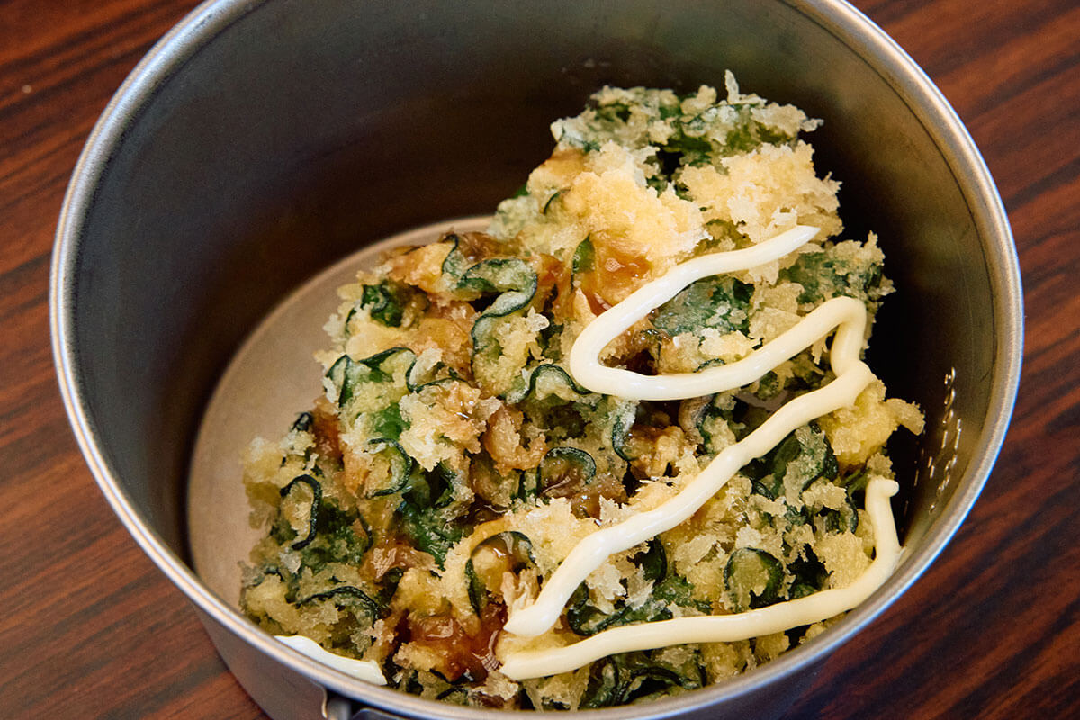前菜は、メカブのカツレツ。肉厚なメカブの歯応えとサクサクの衣、そしてほどよい油がちょうどよくミックスされて、子どもにも大人気です。