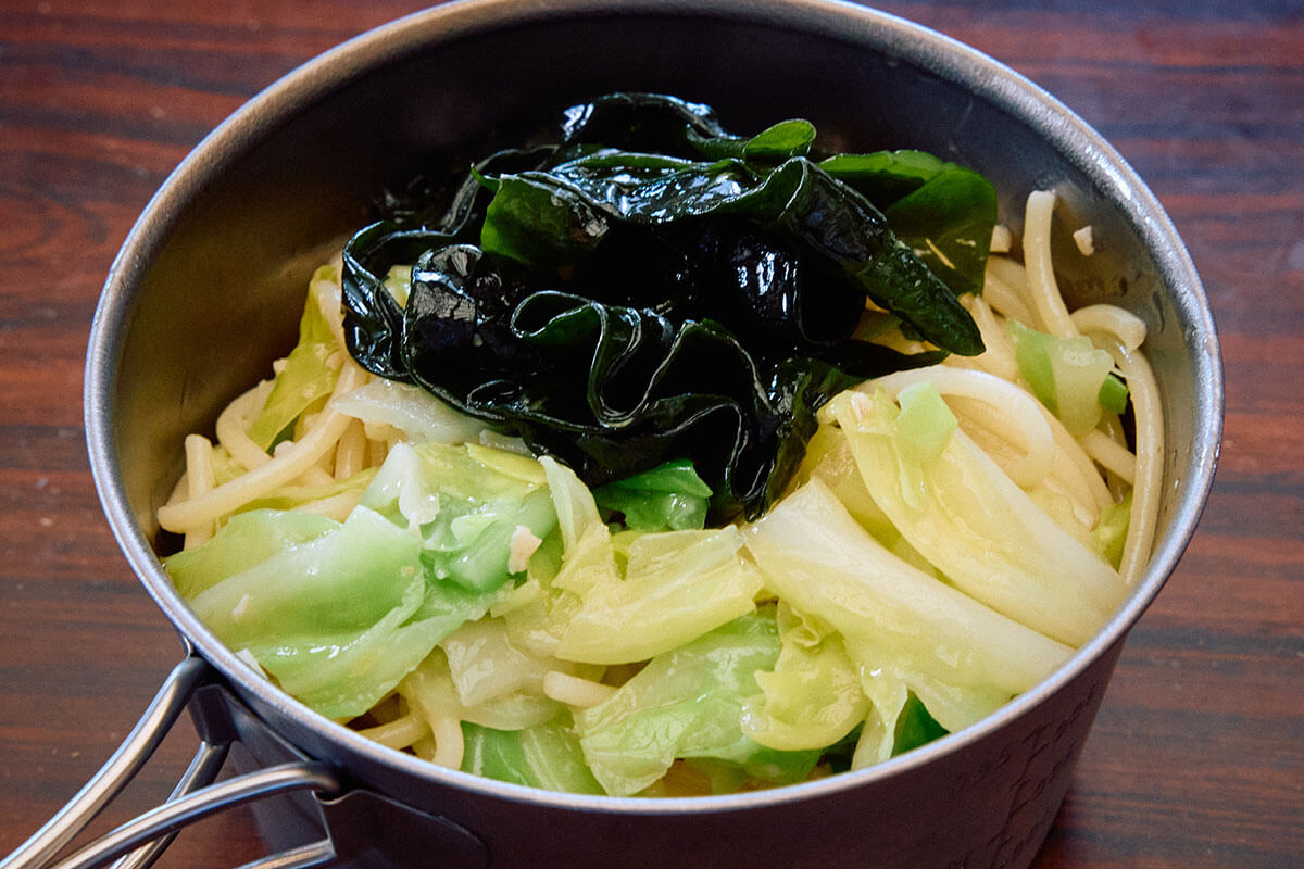 ワカメのパスタ。参加者はお皿と箸も持参しました