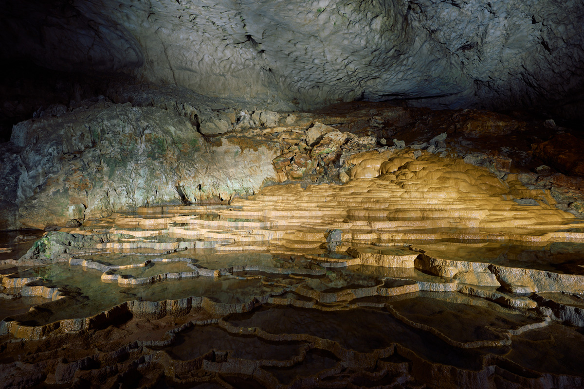 石灰岩の特徴として「酸に溶ける」という化学的な性質があり、二酸化炭素が含まれる雨や土壌水はやや酸性寄りなので、石はそれと反応して溶け続けています。その結果、石にすり鉢状の穴ができたり、凹凸の多い地形が形成されたりするわけです。流れた水は、地下に入ったあとに水路を作ります。地下水は水路の壁や床、天井を溶かしながら進んでいくので、結果的に洞窟が形成されます。