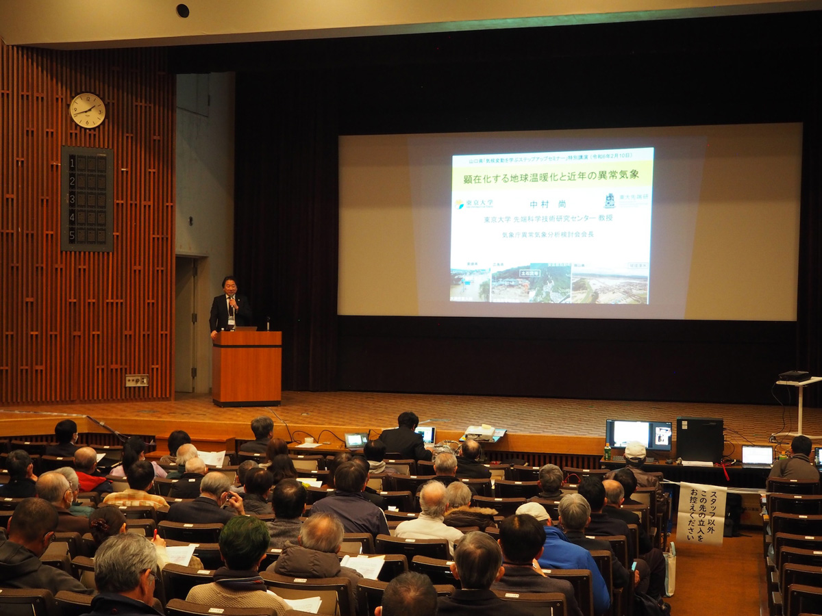 その枠組みの中で、気候変動の最先端の研究をされている先端研と山口県気候変動適応センターで連携したという経緯です。2024年2月には『気候変動を学ぶステップアップセミナー』を開催し、中村先生、飯田先生を講師にお招きし、地域の活動団体の方や高校生の環境活動の発表や、グラフィックレコーディングなどを用いたパネルディスカッションを行いました。