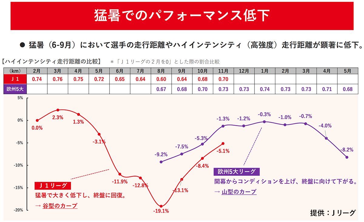 もちろん、暑さについても皆さんが肌で実感されている通りです。いままでだと7〜8月が暑いといわれていたのが、6月も9月も暑くなっています。暑いと、やっぱり走れないんです。開幕のために準備をして、そこからハイインテンシティ(高強度)なプレーが続くのですが、6月ごろからパフォーマンスが下降曲線をたどり始め、7〜8月で底に落ち、9月ごろから少しずつ上がって、11〜12月の終盤でまた走る強度などが高くなっていくことがわかっています。