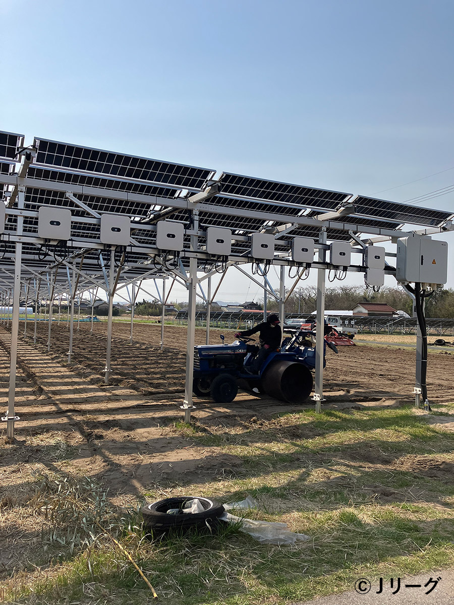 水戸ホーリーホックも耕作放棄地を活用し、ソーラーシェアリング『GRASS ROOTS FARM 太陽光発電所』を展開中です。地域に再生可能エネルギーを増やしていくとともに、化学肥料を使わない野菜の栽培をおこないながら将来的には有機JAS認証取得を目指すとともに、後継者不足という地域課題の解決に繋げて地域に広く貢献していきたいという思いをもって事業を推進しています。