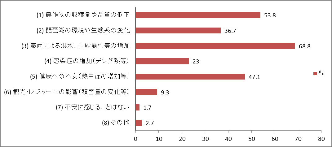 また、温暖化対策課では、滋賀県地球温暖化防止活動推進センターが実施する普及啓発事業の一環として「地球温暖化に関するアンケート調査」を実施しました。平成30年7月から平成31年3月までの期間で約2,200名から回答が得られました(図2)。県民が地球温暖化に伴う影響で不安に感じることとしては、「豪雨による洪水、土砂崩れ等の増加」が68.8%と最も多く、次いで「農作物の収穫量や品質の低下」が53.8%、「健康への不安(熱中症の増加等)」が47.1%、「琵琶湖の環境や生態系の変化」が36.7%と続く集計結果となりました。