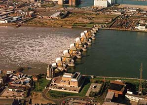 イギリスでは、2012 年から適応プログラムを始動し、洪水リスク管理、水資源、淡水生態系などを優先分野として適応策に取り組んでいます。テムズ川河口の施設改良では、海面水位よりも低い土地を守るため、延長18㎞にも及ぶテムズ防潮堤を設置しました。年10回程度の高潮に際しても、ゲートを閉じて浸水被害を防いでいます。テムズ川流域にある水門「テムズ・バリア」は、海面が仮に毎年 8mmずつ上昇したとしても、2030 年までは高潮に耐えられる設計になっています。