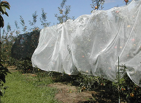 夏季(りんご果実着色期)の高温や果実への直射日光により、果皮の色が白や橙色、褐色に変化することがあり、ひどい時には果肉も変質し商品価値が低下します。これをりんご果実の日焼けと呼び、温暖化の進行に伴い増加することが懸念されています。この対策として長野県では、果実への強い日射をさえぎるための寒冷紗を設置して日焼けの軽減をはかっています。