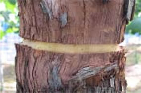 瀬戸内沿岸地域では成熟期の気温が高いため、ブドウの着色が不良となりやすく、特に赤色品種の「安芸クイーン」でその傾向は顕著です。そのため、現在着色の良い産地でも、温暖化に伴い着色不良問題が発生する可能性もあります。着色不良果は食味が良好でも価格が大きく低下します。環状はく皮(幹の皮部を環状に剥ぎ取ること)は着色を向上させることが古くから知られていますが、単に環状はく皮を行うだけでは効果は小さく、温暖地ブドウの着色向上には不十分です。