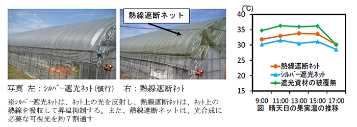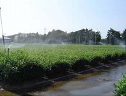 静岡県では、夏季の異常高温、干ばつ対策として、スプリンクラー等によるかん水技術の普及を推進しています(図1)。また、気候変動による萌芽期・摘採期の早まりがあった場合に、これまでより早期に対策する必要性がある春季の晩霜※対策として防霜技術も取り入れています。放射冷却で温度低下した地表面に高所の暖かい空気を吹き下ろすことによって農作物の温度上昇をねらう防霜ファンが広く普及しています(図2)。