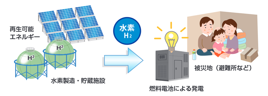 大規模な停電が起きた時には、太陽光発電で作り貯めておいた水素を使って電気や熱を取り出すことが可能です(図1)。また、停電に対応した家庭用燃料電池(エネファーム)は、ガスや水道の供給があれば、停電した時でも水素を生成して発電し、家庭に電気やお湯の供給が可能となります(図2)。他にも、水素を燃料として車載する燃料電池自動車(FCV)や燃料電池バス(FCバス)は、電気自動車(EV)に比べて高い外部給電機能(注3)があり、その機能を分散型電源として利活用することにより災害時には各家庭や避難所で非常用発電機として使用できるほか、企業のBCP(注4)対応に有効であると期待されています(図3)。このように、自立・分散型エネルギー供給電源として水素を利活用することにより、既存の電力系統(注5)を補完することが可能となり、災害に強いまちづくりにもつながると期待されています。
