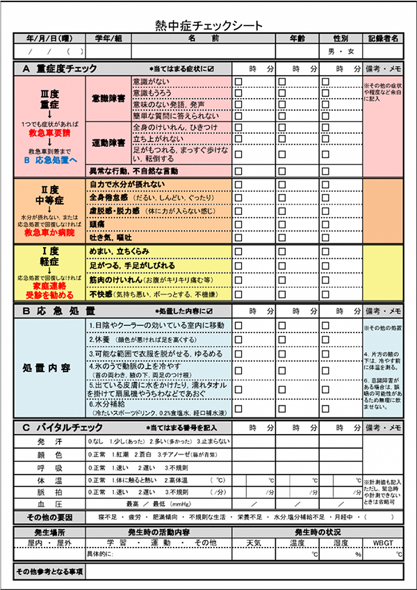 - 弘前大学教育学部附属学校園の保健室ウェブページ 「熱中症チェックシート」(2020年11月1日更新)