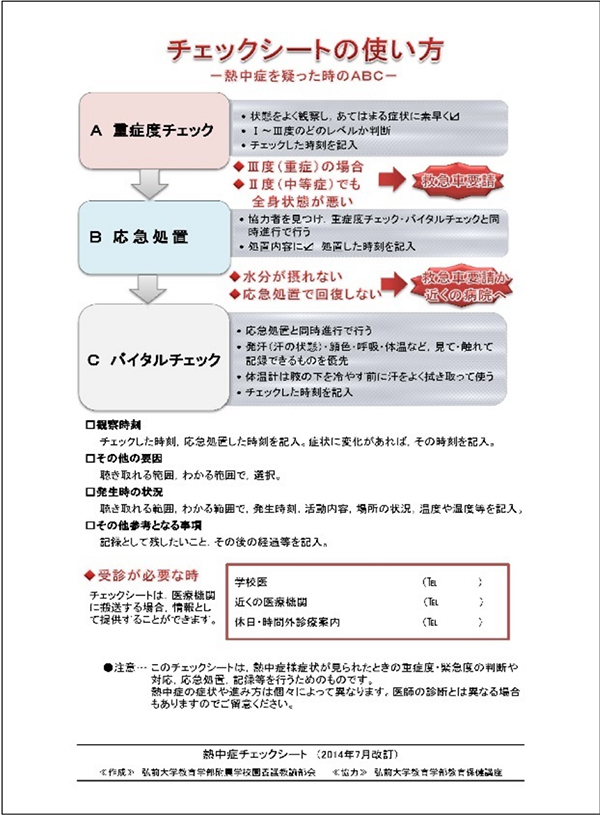 弘前大学教育学部附属学校園(以下、附属学校園)では、2012年に熱中症対策の取組の一環として、学校における熱中症に対する重症度の「迅速な判断」と「適切な対応」のため、「熱中症チェックシート(試用版)」を考案しました。さらに青森県内の養護教諭の協力のもと、チェックシートの試用と改訂を重ね、2014年7月に全教職員が学校において児童生徒の熱中症に対応できる「熱中症チェックシート」を開発しました。