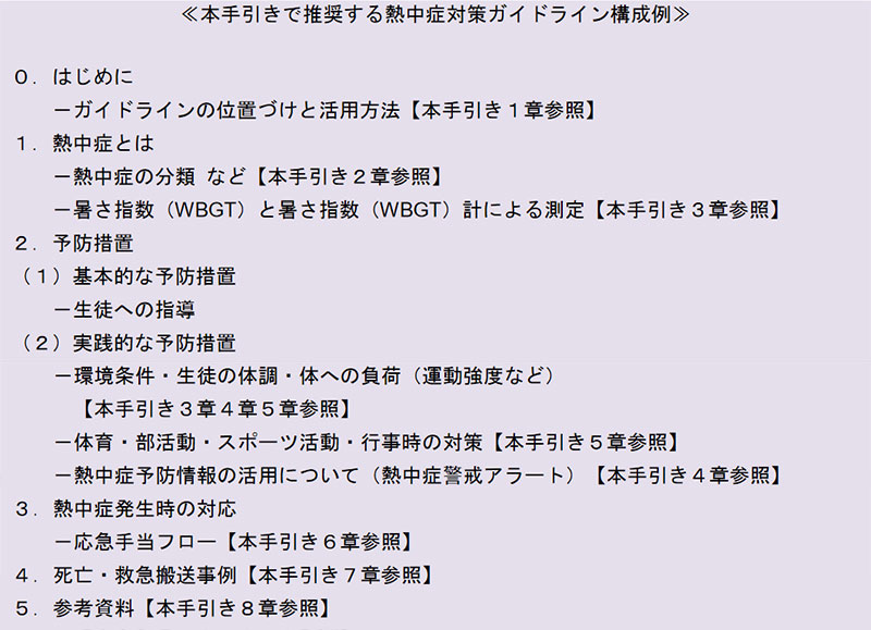 環境省・文部科学省は、2021年2月及び3月に「学校現場における熱中症対策の推進に関する検討会」を開催し、学校における実際の熱中症対策や判断の参考となる事項について検討のうえ、「学校における熱中症対策ガイドライン作成の手引き」を作成しました。本手引きは、各学校において危機管理マニュアルの見直しや改善等を行う際に参考となるよう、推奨する構成例に基づいて記載されています(図1)。