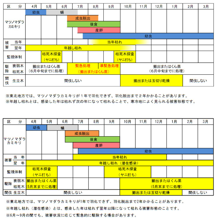 被害が拡大する時期の見直しにより、ヤニ打ち(注1)や、衰弱木や枯死木の搬出または燻蒸処理(注2)の時期を早める等、「マツノマダラカミキリ」の活動や、現場で行われている「被害木の発生の監視」「予防」「駆除」のスケジュールなどに合わせた改訂が見られます(図1)。