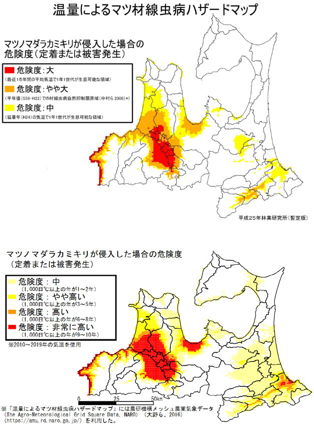 また、松くい虫被害発生の危険度を示す「温量によるマツ材線虫病ハザードマップ」も更新されました。これは、1年間の日平均気温が13℃を超えた地点だけ抽出した上で、合計1,000日℃以上の場所で「マツノマダラカミキリ」は定着できるという条件を基に、平成22年~令和元年の気温から作成されたものです。
