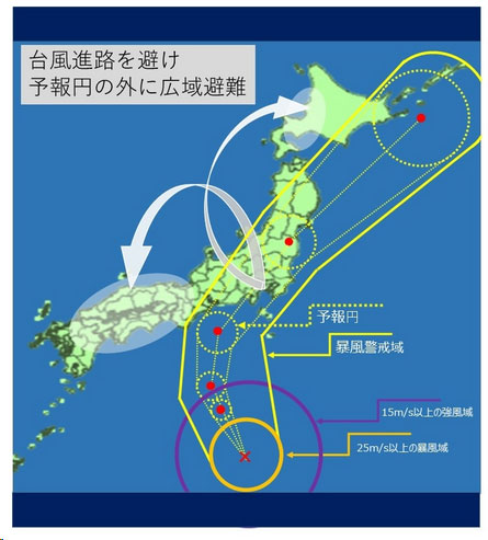 江戸川区では、大規模水害時には、浸水が想定されない区外への広域避難(分散避難(注2))を推奨しています(図1)。広域避難先は、事前に確保することが重要で、その候補としては、区外の親戚・知人宅のほか、行政が用意した公的な広域避難先(注3)などが考えられます。しかし、公的な広域避難先には避難できる人数に限りがあり、親戚や知人などに頼ることが難しい場合もあることから、自身でホテル等の予約を行い、宿泊施設に避難することも有効な手段です。広域避難を行う場合は、台風であれば、予報円の外になる地域を推奨しています(図2)。