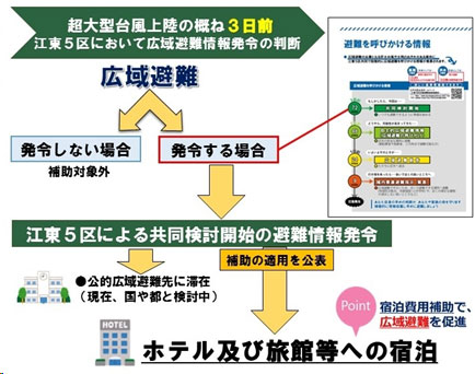 また、江戸川区は広域避難を促進するために「江戸川区大規模水害時自主的広域避難補助金」を創設しました。これは、江東5区が「広域避難情報」を共同で発令した場合に、江戸川区民がホテルや旅館などの宿泊施設を自主的広域避難先として確保するための経費の一部を補助する制度です。1人最大9,000円(1泊3,000円、3泊まで)とする補助金の申請が可能です(図3)。