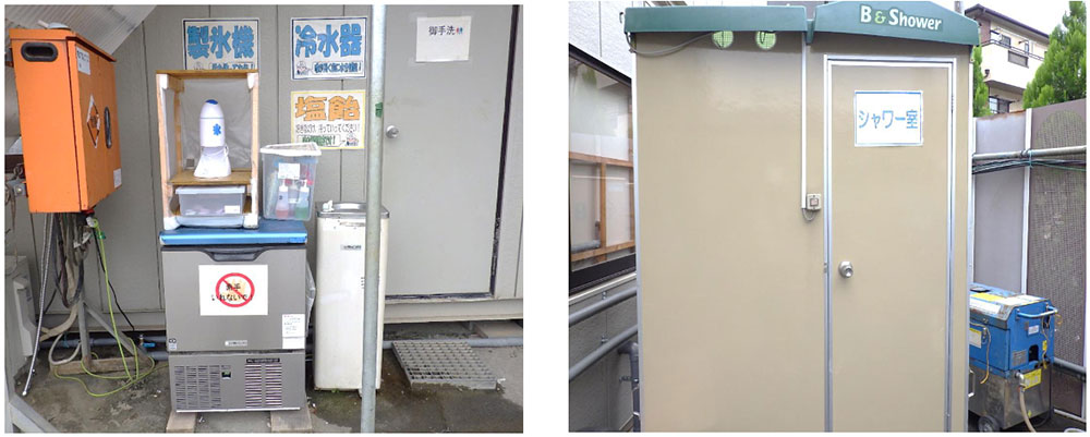 個人の症状や休憩時間に合わせて利用しやすいよう、冷水器・製氷機・かき氷機・塩飴・シャワー室など多様な対策グッズを工事の実施業者が現場に用意する取組み(図1)。