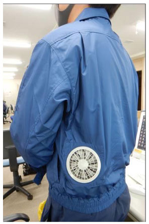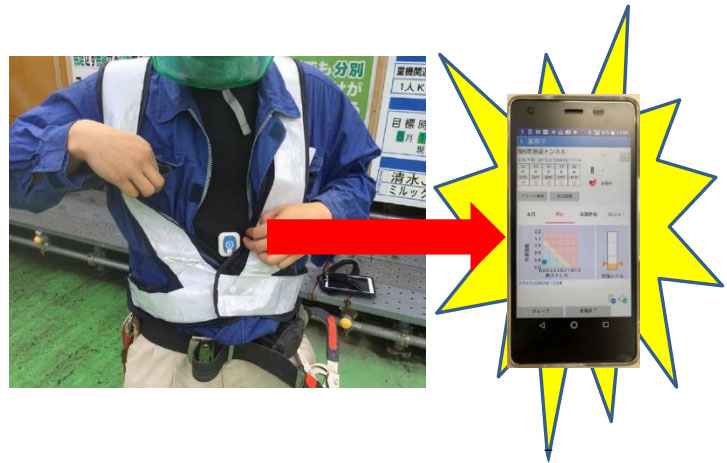 電動ファンのついた空調服の着用の奨励や作業員のシャツに検知器を取り付けて体調変化や転倒などの状態を検知し、管理者のパソコンや作業員のスマートフォンに通知してリスクの見える化を行い、危険時にアラートを鳴動させる等のIoTを活用した取組み(図2、図3)。
