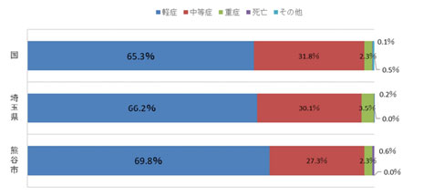 熊谷市における熱中症救急搬送者の初診時における傷病程度については、埼玉県や全国の数値と比較して、中等症以上での搬送者の割合が低くなっています(図3)。このことは、市が 2008年から実施してきた様々な暑さ対策や熱中症予防の啓発により、熱中症が死に至る危険もあるということが市民に周知され、早めに対処している証ではないかと考えられます。