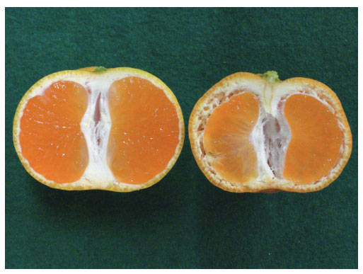 そのため、温州ミカンの果皮障害である浮皮(図1)や過熟の発生による収量の低下や果実着色不良(遅延)による商品化率の低下が懸念されています。