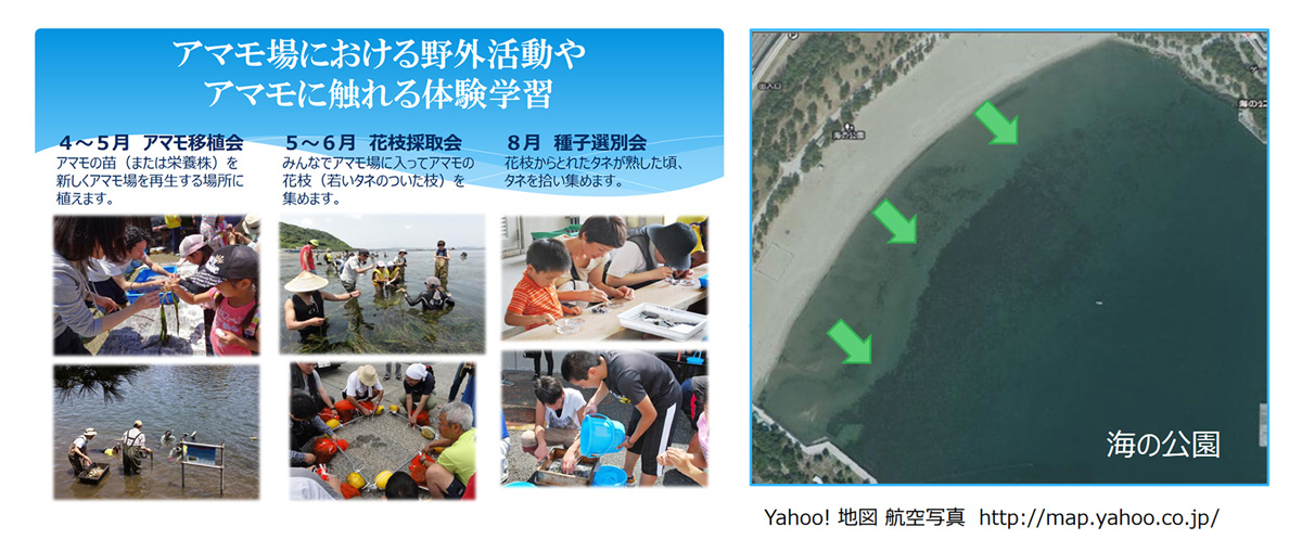 アマモ等の海草は、沿岸生態系の基盤を構成する重要な要素である。しかしアマモ場は全国的に減少している。一方、アマモ場は炭素固定などを通じて気候変動緩和に重要な役割を果たしうることが指摘されている。そのため、アマモ場の保全・再生は、気候変動への適応と緩和の両面に貢献できる可能性がある。