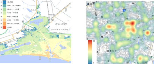 気候変動適応分野においても、暑熱対策(暑さ指数(WBGT)の可視化等)や防災(ハザードナップ等)、気候変動影響予測・評価結果の可視化など様々な場面で活用されている。