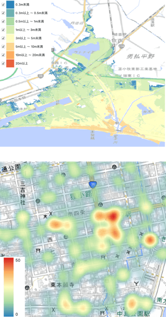 また、データを重ね合わせて可視化するだけでなく、それぞれのデータの空間的な関係性をもとにデータの加工や解析を行うことが可能である。