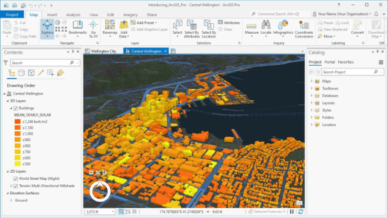 基本機能として地理情報データの表示・解析・編集を行うことができ、Spatial Analystや3D Analystなどの有料のエクステンションを使用することで更に高度な解析(3D解析、ラスターデータの解析等)が可能となる。またクラウド型GIS(ArcGIS online、次項参照)との連動も出来、地図の共同編集や発信もノーコードで可能となっている。(図2-1)