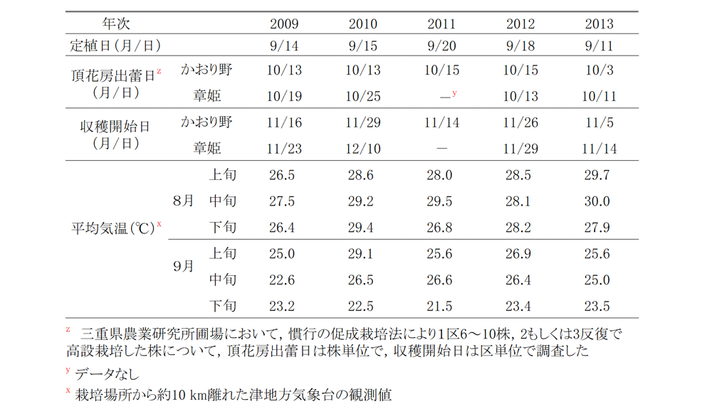 Table: Dates of apical inflorescence budding and harvest start of “Kaorino” and “Akihime” and average temperatures in first, middle and last thirds of August and September in 2009 to 2013