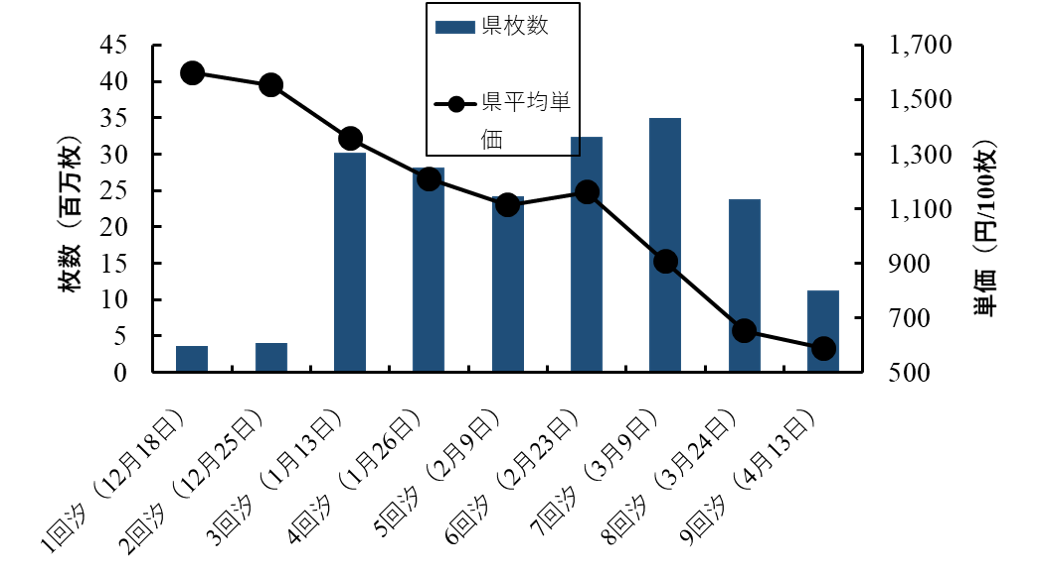 In Mie Prefecture, harvesting of laver begins in early December. Nori products made from laver harvested within the year are generally soft and high in quality and they are traded at a high price (Figure 3). The producers’ incomes greatly depend on how much they can produce yields while the laver can fetch a high price. It is necessary to start farming as early as possible. Mie Prefecture started research to develop a laver variety resistant to high water temperatures in FY 2005.