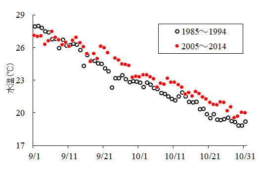 Black laver farming begins in early October when the seawater temperature falls below 23℃. Recently, there are delays in the seawater temperature falling below 23℃ in October (Figures 1 and 2). The temperature sometime stays around 23℃ or it falls once and goes up again. It is getting harder to decide on when to start farming. If the start of farming is delayed, the farming period is shortened and the yield is reduced.
