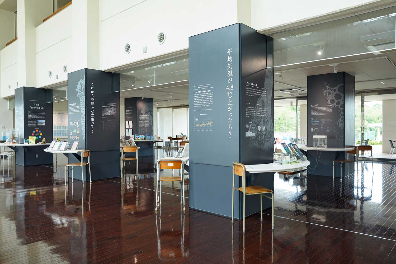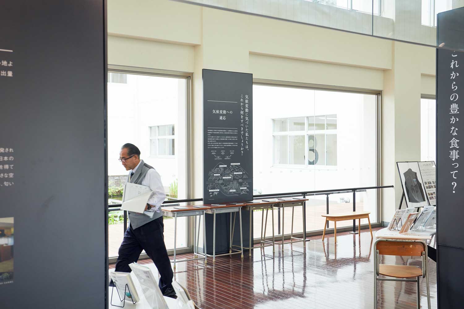Yamada: I tried to express what individuals can do about the impacts from climate change as simply as possible. The exhibits show impacts on the prefecture’s main agricultural products, such as tea, wasabi and orange, and the adaptation measures. Learning that orange made in Shizuoka might no longer be available in the future due to climate change, some people may accept the fact and think it can’t be helped. Other people may become aware and decide that something must be done to conserve it. We will continue to provide visitors with a trigger to think as their own problem. The museum was formerly a high school. As a remnant from the past, books are placed on the desks in the adaptation exhibition. Every adult should have experience of reading a text at school. I hope the arrangement will remind visitors of their school days.