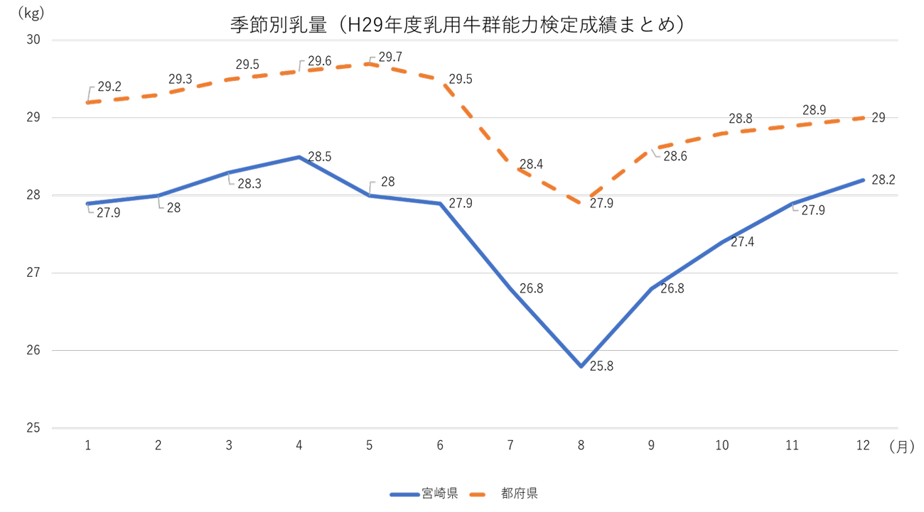 Demand in the market is the highest in summer. It is important for farmers to produce a large amount of quality milk in this season. To target the summer when the market value is high, cows must become pregnant in July to September in the previous year. Due to global warming, there is concern about a fall in the conception rate. In addition, demand for fertilized eggs of Japanese Black cattle as the prices of Japanese Black calves are soaring. Normally, about six fertilized eggs are produced by a session of superovulation. According to a test by the Miyazaki Livestock Research Institute, the number of fertilized eggs is reduced to one under heat stress.