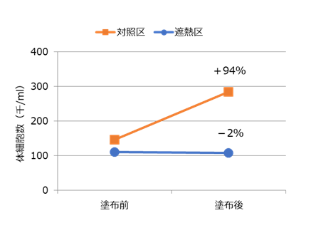 Matsuo:The test (1) has indicated that the application of the paint has an effect on the environment in a cowshed. When thermal insulation paint was applied to the roof, the radiant heat under the roof was suppressed by 20°C compared with the control area and the temperature in the cowshed was lower in the heat insulated area than the control area. The somatic cell count in milk used as an indicator of the onset of garget increased by 94% in the control area whereas little changes were observed in the heat insulated area (Figure 2). The result showed that the application of thermal insulation paint was expected to reduce stress on dairy cattle and improve the productivity.