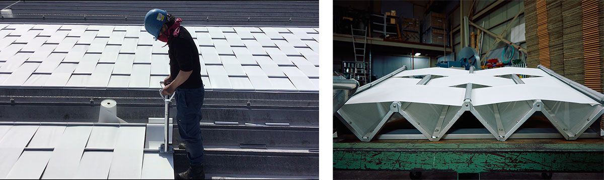 In terms of its installation method, the Roof Shade can be set up simply by first covering a folded-plate roof with the roof screens and then crimping them with the shade grippers so that they are fastened to the roof. Once these narrow screens are fastened to the roof in zigzag formation, the roof surface is completely shielded from sunlight when it is viewed from above, while there are triangular spaces in between when viewed from the side. These spaces are designed to keep the roof well-ventilated and prevent the heat from getting caught inside.